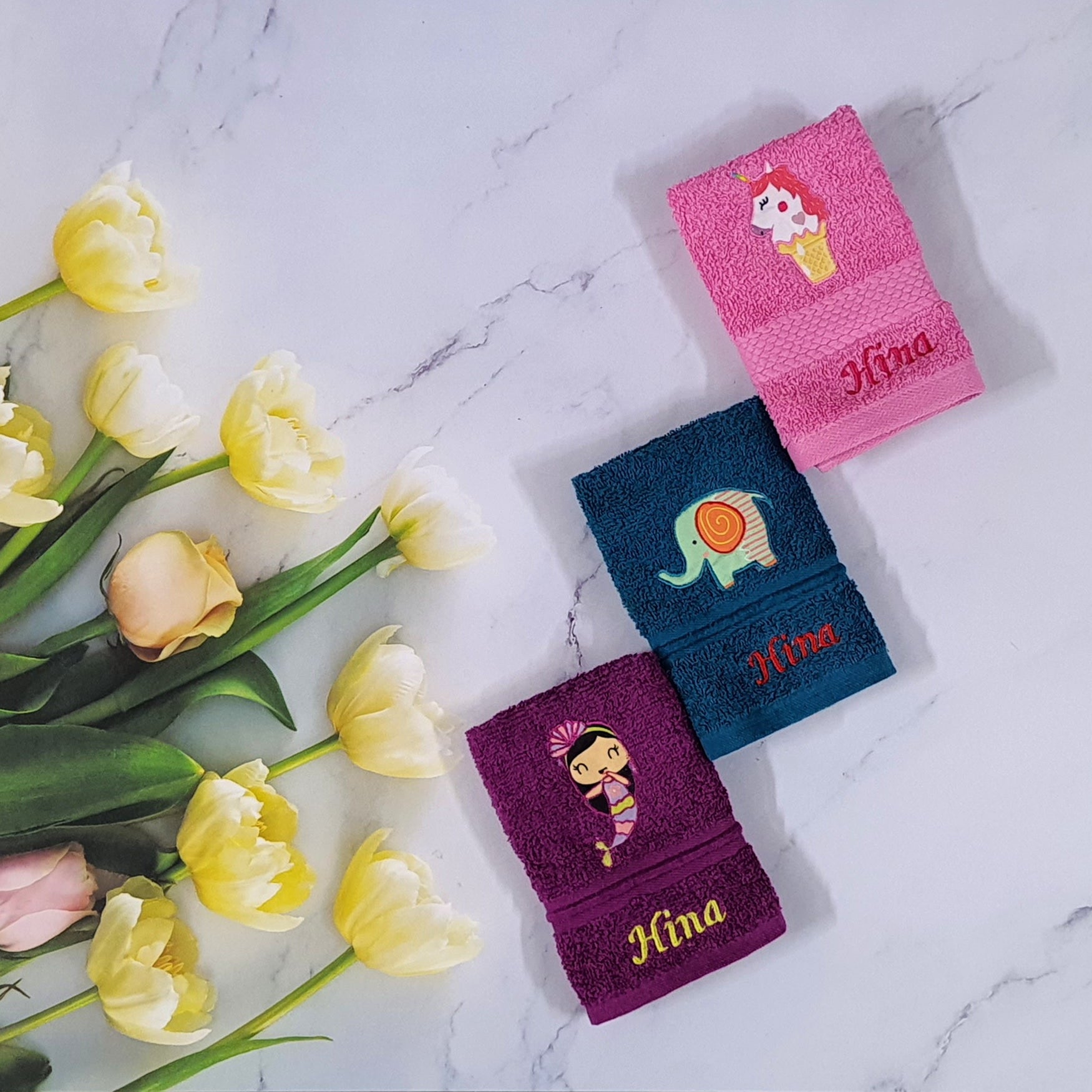 Our appliquéd embroidered terry face napkins set of 3 and 6 in size is 12” x 12” (30 x 30 CMS) with a weight of 42 grams each. These are very high quality 450 GSM (Grams per square inch) napkins, in attractive colours with cute appliquéd and embroidered motifs in different themes. These are 100% terry cotton and made from extra-long staple fibre and specially treated for maximum softness, higher absorbency, and a quicker dry time. Super water absorbent, skin friendly fibres dry and warm your kids instantly. Having their name and favourite appliques on the napkins, makes your child feel loved and special. And when these are given in the tiffin, children look forward to opening their tiffin. We have come up with 15 unique designs in 12 attractive colours at present. For personalization, please send the name of the child via email at support@sweetheartcreations.com, call or WhatsApp on 8779250858.