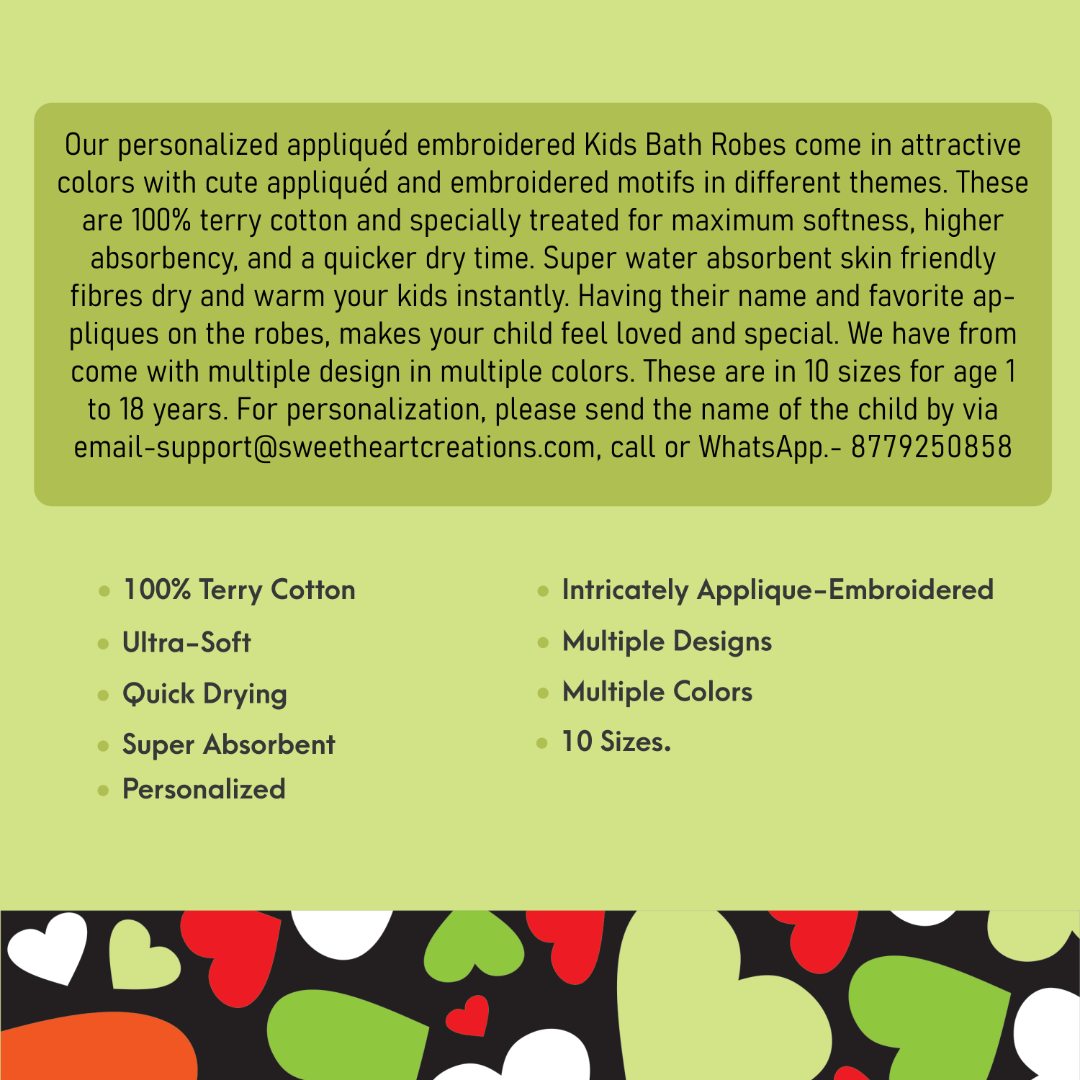 Our personalized appliquéd embroidered Kids Bath Robes come in attractive colors with cute appliquéd and embroidered motifs in different themes. These are 100% terry cotton and specially treated for maximum softness, higher absorbency, and a quicker dry time. Super water absorbent skin friendly fibres dry and warm your kids instantly. Having their name and favorite appliques on the robes, makes your child feel loved and special. We have come up multiple unique designs in attractive colors . These are in 10 sizes for age 1 to 18 years. For personalization, please send the name of the child by via email at support@sweetheartcreations.com, call or WhatsApp on 8779250858.